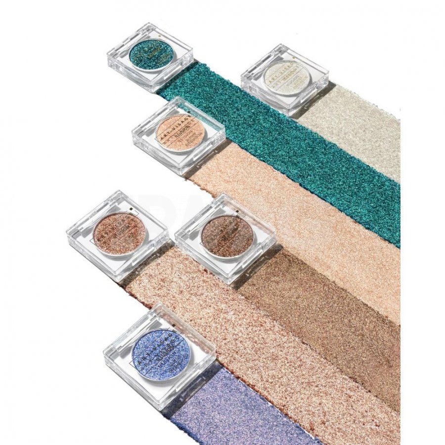 Полупрозрачная текстура с пигментацией от легкойдо средней. Глиттеры разных оттенков и размеров создают объемное голографическое сияние — словно россыпь драгоценных камней на веках!