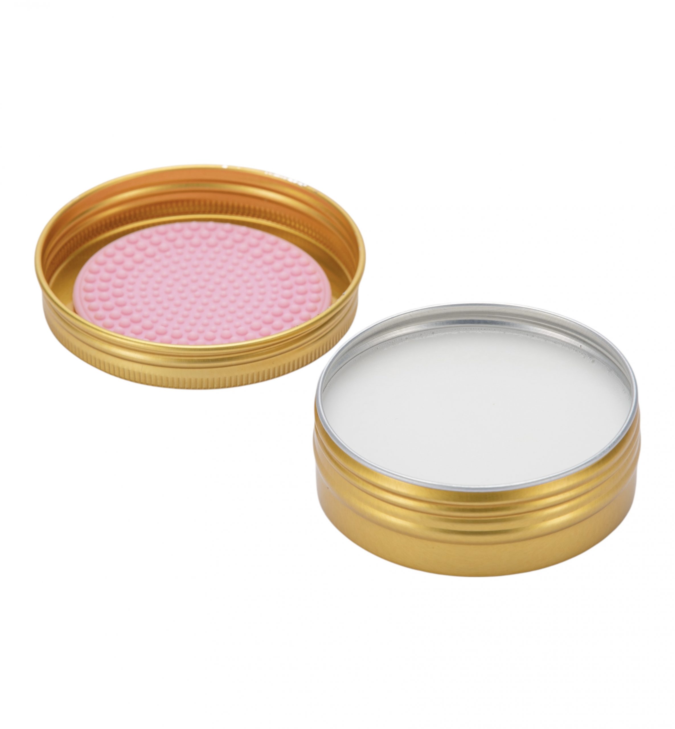 В комплекте – удобная металлическая упаковка с крышкой, внутри которой находится силиконовая ребристая поверхность. Она помогает тщательно промывать кисти, обеспечивая глубокое очищение.