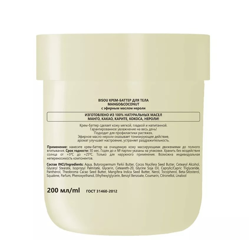 Изготовлено из 100% натуральных масел манго, какао, карите, кокоса, нероли. Крем-баттер сделает кожу мягкой, гладкой и напитанной. Гарантированное увлажнение на весь день. Подходит для профилактики и коррекции растяжек. Эфирное масло нероли оказывает тонизирующее действие, улучшает настроение, устраняет раздражительность.